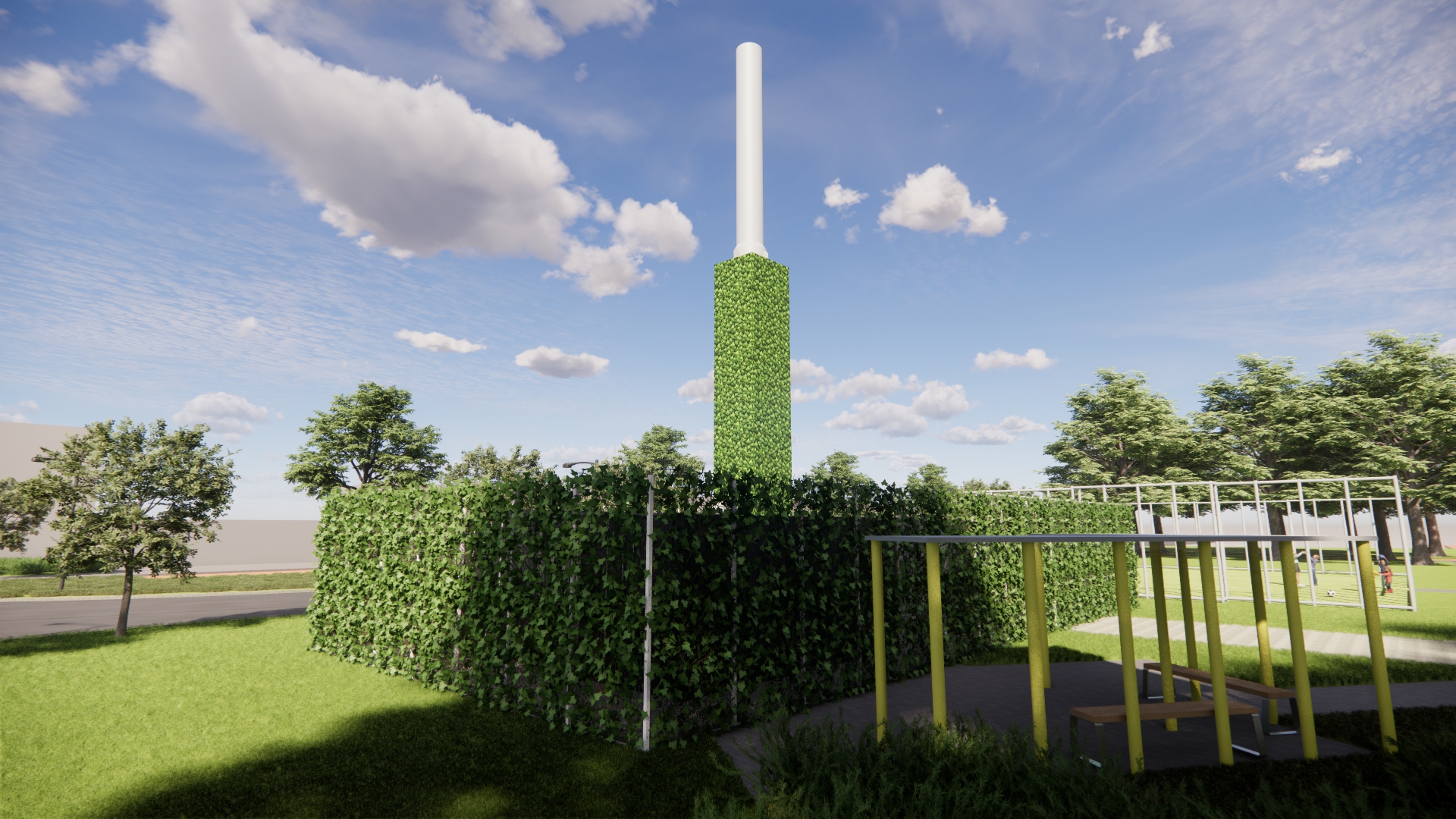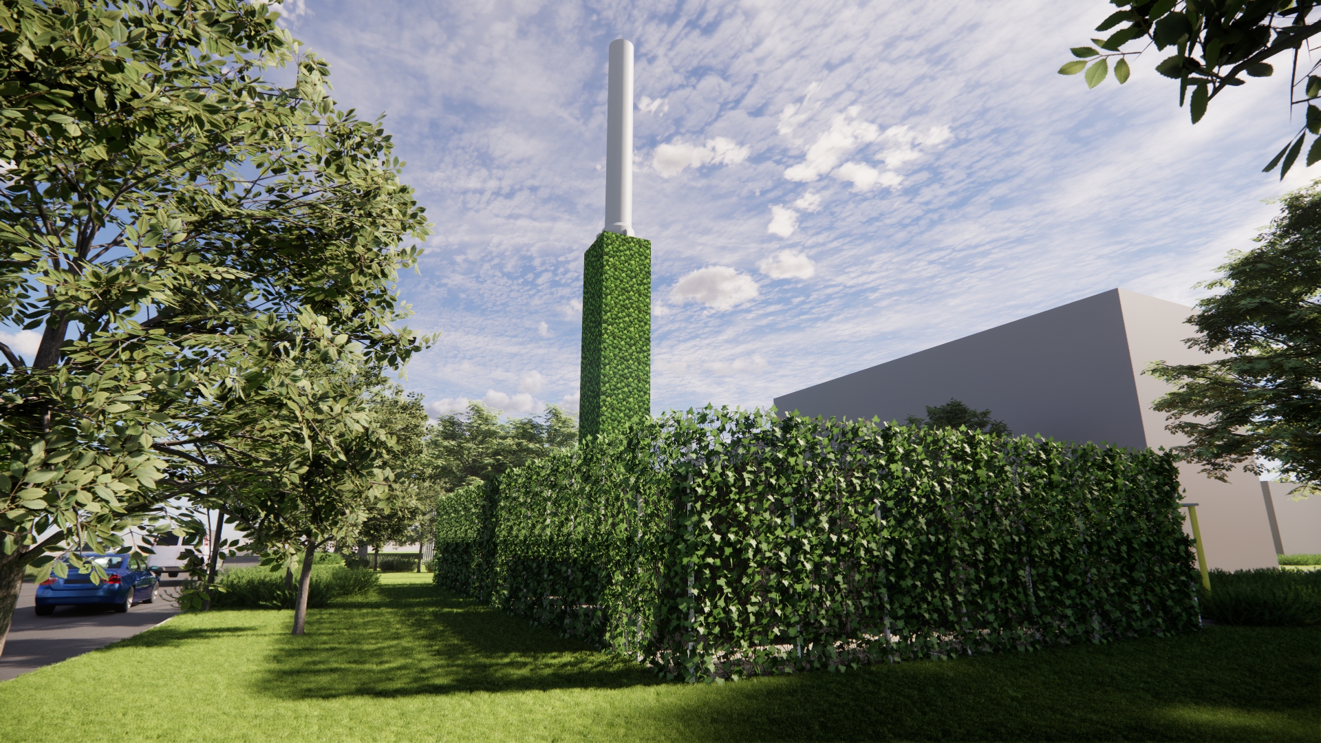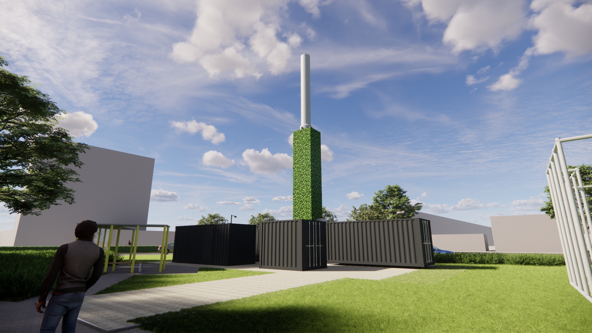 Het station bestaat uit 4 nette stalen containers met daarin de verschillende onderdelen van de warmte-installatie. Om het warmtestation komt een hekwerk van 3 meter hoog met daarom heen een groene klimhaag van hedera. De containers zijn vanaf straatniveau dan niet meer zichtbaar. Ook de rookgasafvoer bekleden we zoveel mogelijk met hedera zodat het één geheel wordt.