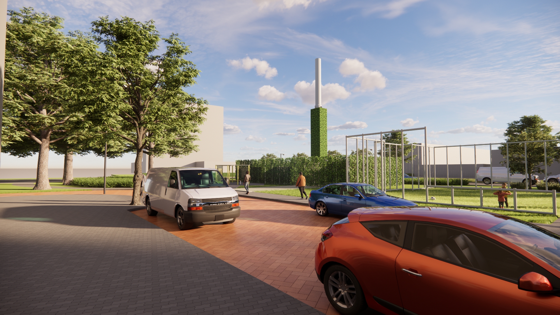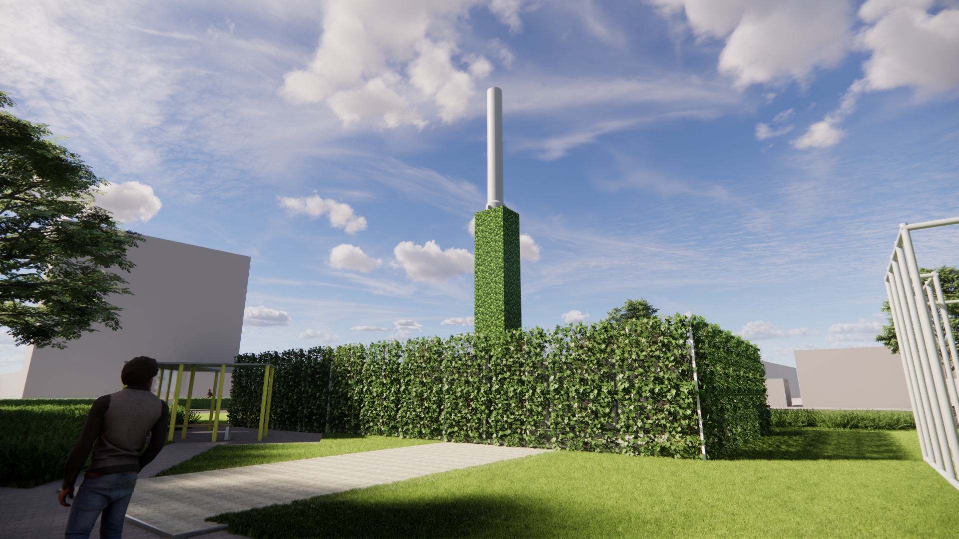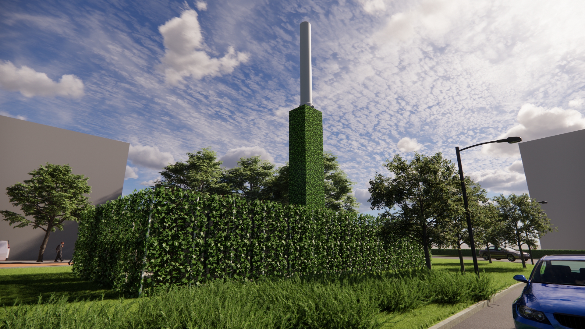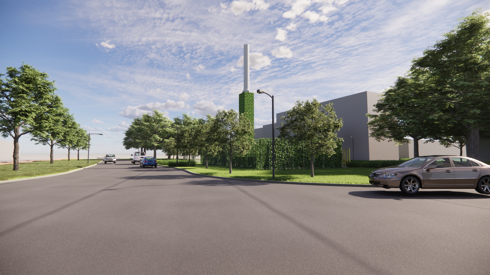 Het station bestaat uit 4 nette stalen containers met daarin de verschillende onderdelen van de warmte-installatie. Om het warmtestation komt een hekwerk van 3 meter hoog met daarom heen een groene klimhaag van hedera. De containers zijn vanaf straatniveau dan niet meer zichtbaar. Ook de rookgasafvoer bekleden we zoveel mogelijk met hedera zodat het één geheel wordt.
